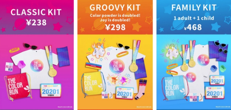 Los tres tipos de kits de esta edición en Beijing también se han renovado por completo. Durante los primeros tres días de inscripción habrá tarifa “early bird”, hasta agotar cupos. El kit clásico incluye camiseta, pañuelo, bolsa con cordón, dorsal, polvos de colores, gafas de sol, pegatinas tipo tatuaje y una pulsera conmemorativa del décimo aniversario. El kit de lujo, además de lo anterior, añade un paquete extra de polvos de colores, una cinta para el pelo del décimo aniversario, calcetines deportivos, gafas de sol de estilo y un colgante de unicornio para la mochila. El kit familiar (1 adulto + 1 niño) suma, sobre el kit clásico, pegatinas tipo tatuaje con estrellas y un colgante de unicornio.