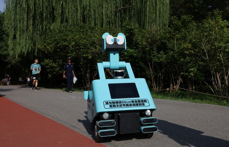 El 7 de agosto, en el Parque Haidian, un robot de patrulla realiza su ronda.
