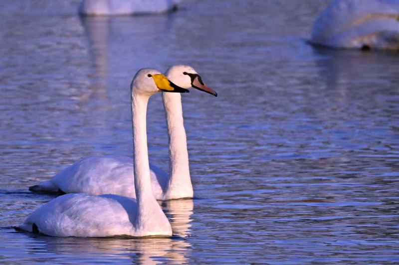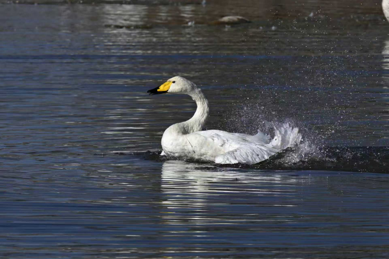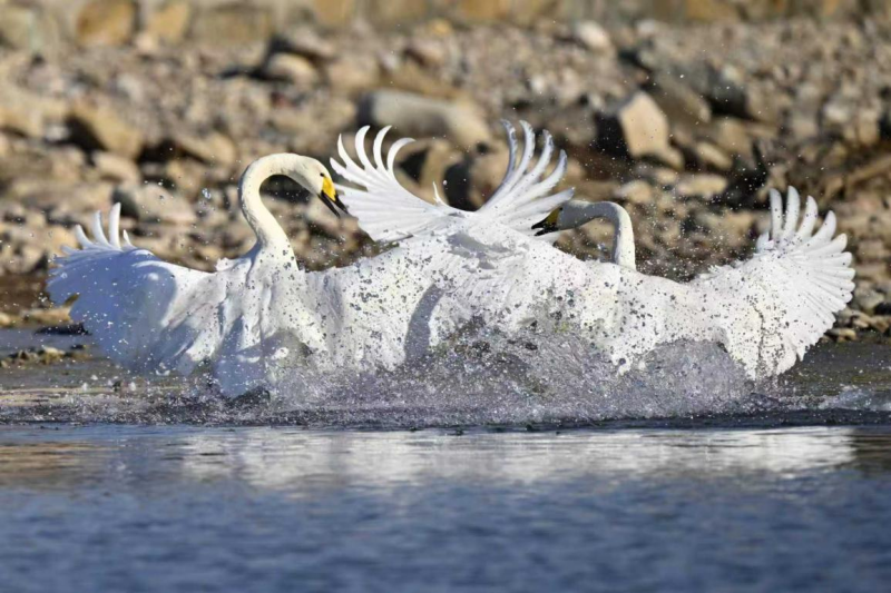 En la cuenca de Lugezhuang, en la zona del Río Qingshui de Taishitun (distrito de Miyun), también se ha observado recientemente la llegada sucesiva de bandadas de cisnes, que vuelan desde las orillas del embalse hasta esta área. Allí se ha formado una singular escena invernal en la que cisnes blancos, cisnes chicos y cisnes de morro negro comparten un mismo estanque para pasar el invierno.
