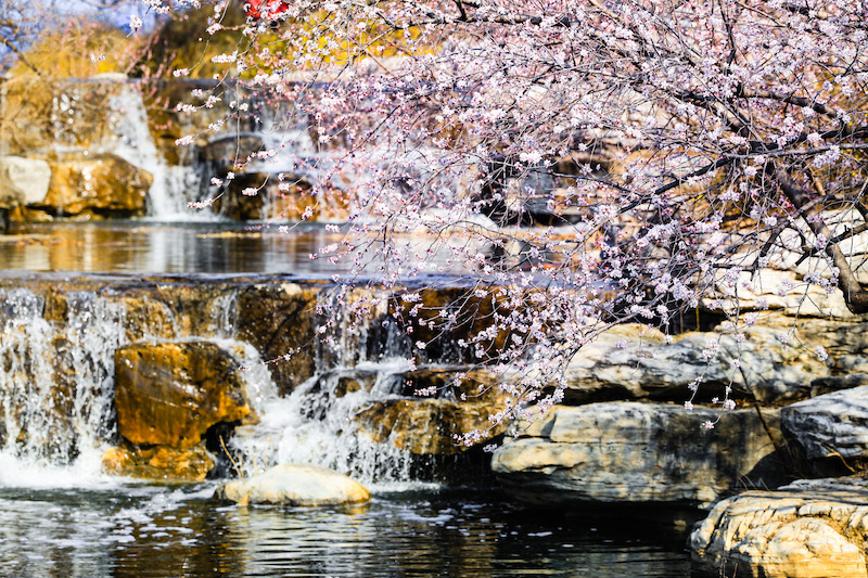 Desde finales de marzo, el arroyo de flores de melocotón silvestre y el jardín de ciruelos entran en su mejor momento de observación. A comienzos de abril, en la avenida de los melocotoneros ornamentales (shanbitao), variedades como “Pinhong”, “Pinxia” y “Baihua shanbitao” florecerán en todo su esplendor. Entre mediados y finales de abril, más de mil ejemplares en el jardín de las flores de melocotón —como los de flor tipo crisantemo, los de la longevidad y los de tipo escoba— alcanzarán su pico de floración.