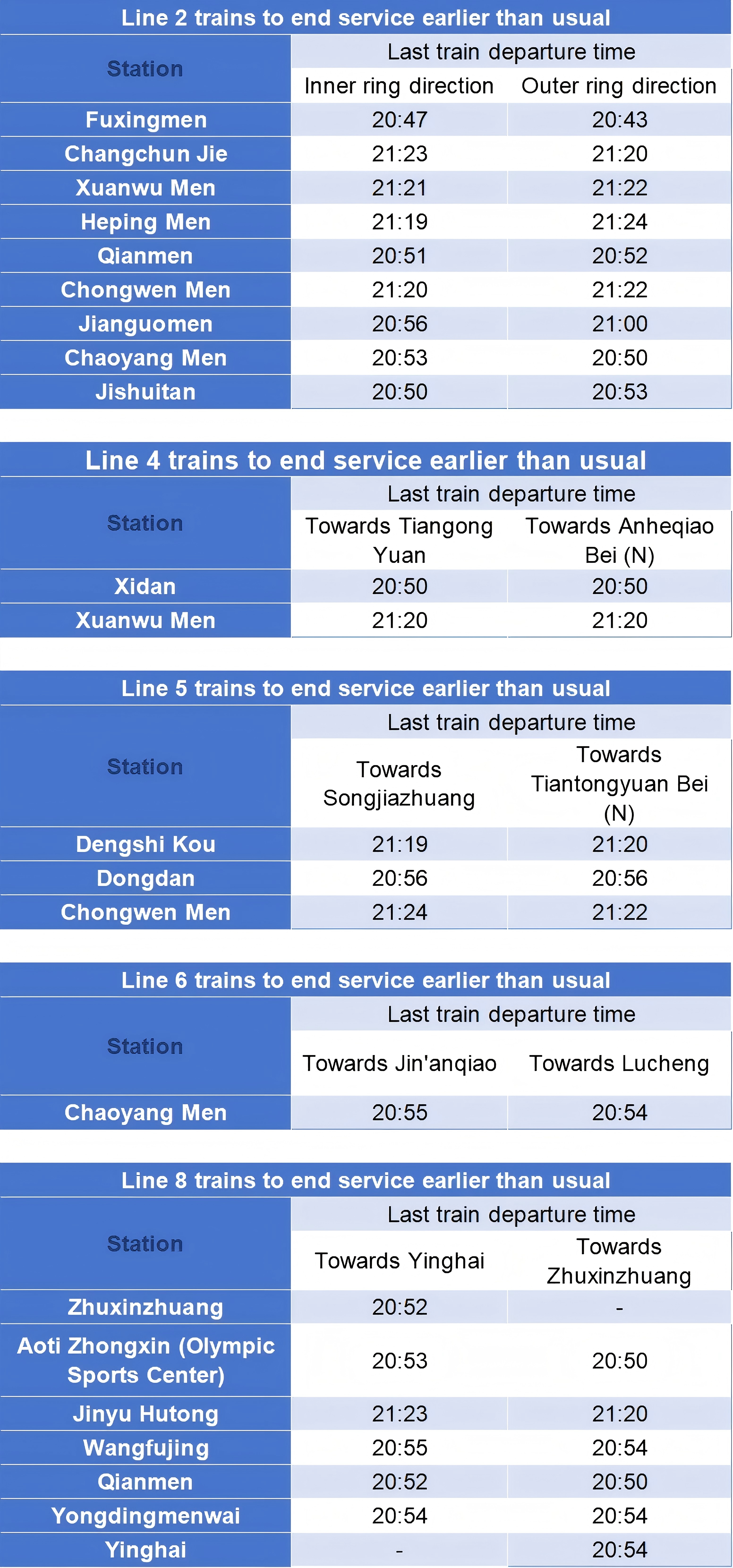 La información sobre los ajustes de operación del metro de Beijing el 2 de septiembre se detalla en la tabla siguiente: