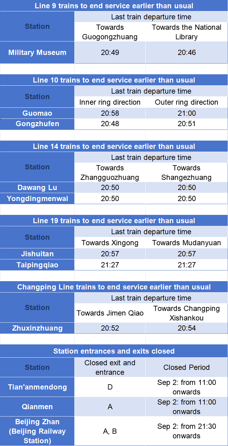 Además, el Grupo de Transporte Público de Beijing anunció que, entre el 2 y el 3 de septiembre, 270 líneas de autobús aplicarán medidas temporales como desvíos, omisión de paradas o servicios parciales. Los pasajeros pueden llamar al servicio de atención al cliente 96166, disponible las 24 horas, para obtener información antes de viajar.