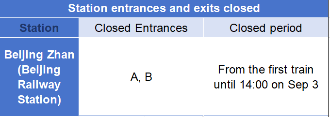 Para garantizar la seguridad y el buen desarrollo de la conmemoración del 80.º aniversario de la victoria en la Guerra de Resistencia del Pueblo Chino contra la Agresión Japonesa y la Guerra Antifascista Mundial, las compañías del metro de Beijing informaron que los días 2 y 3 de septiembre algunas estaciones de varias líneas de metro ajustarán su operación. Para más información, los usuarios pueden llamar a la línea de servicio 96165.